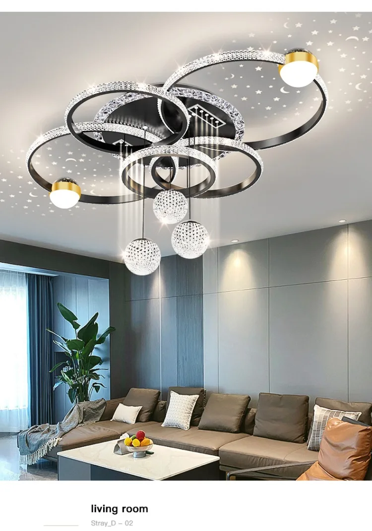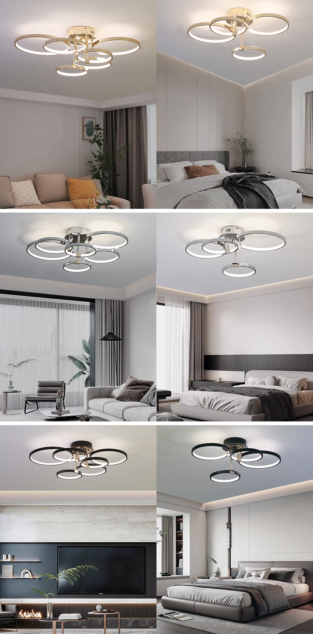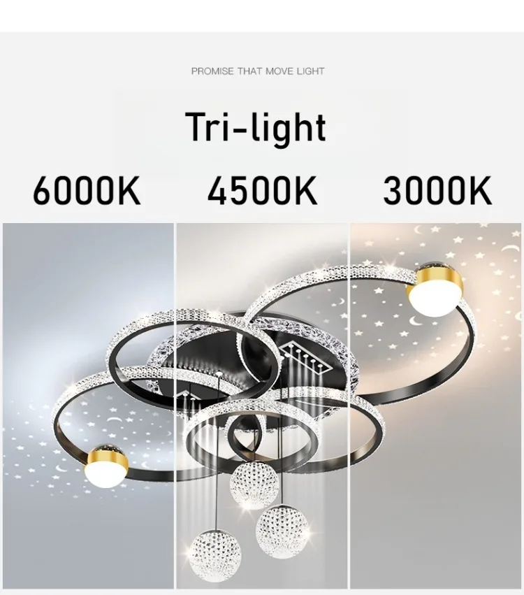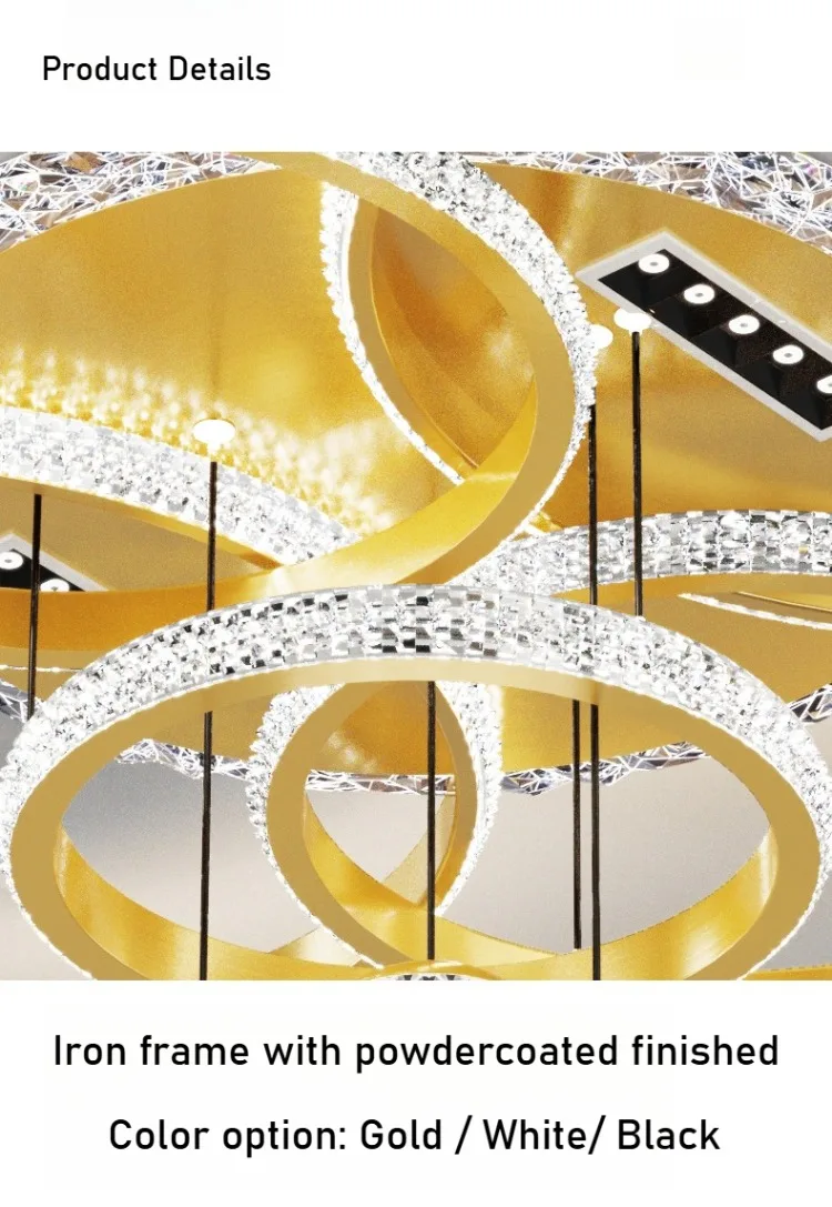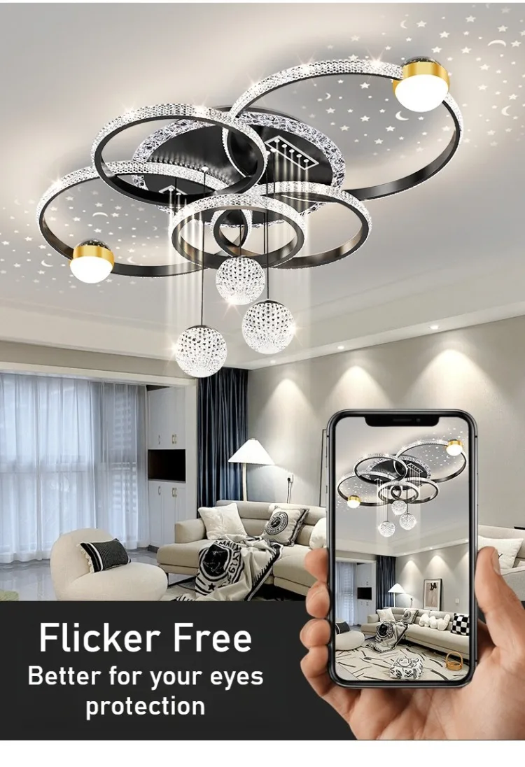 This modern LED chandelier ceiling light combines elegant design with smart lighting control. Available in gold, chrome, or black finishes, it features dimmable lighting and remote control operation, making it ideal for living rooms, bedrooms, and contemporary interiors.