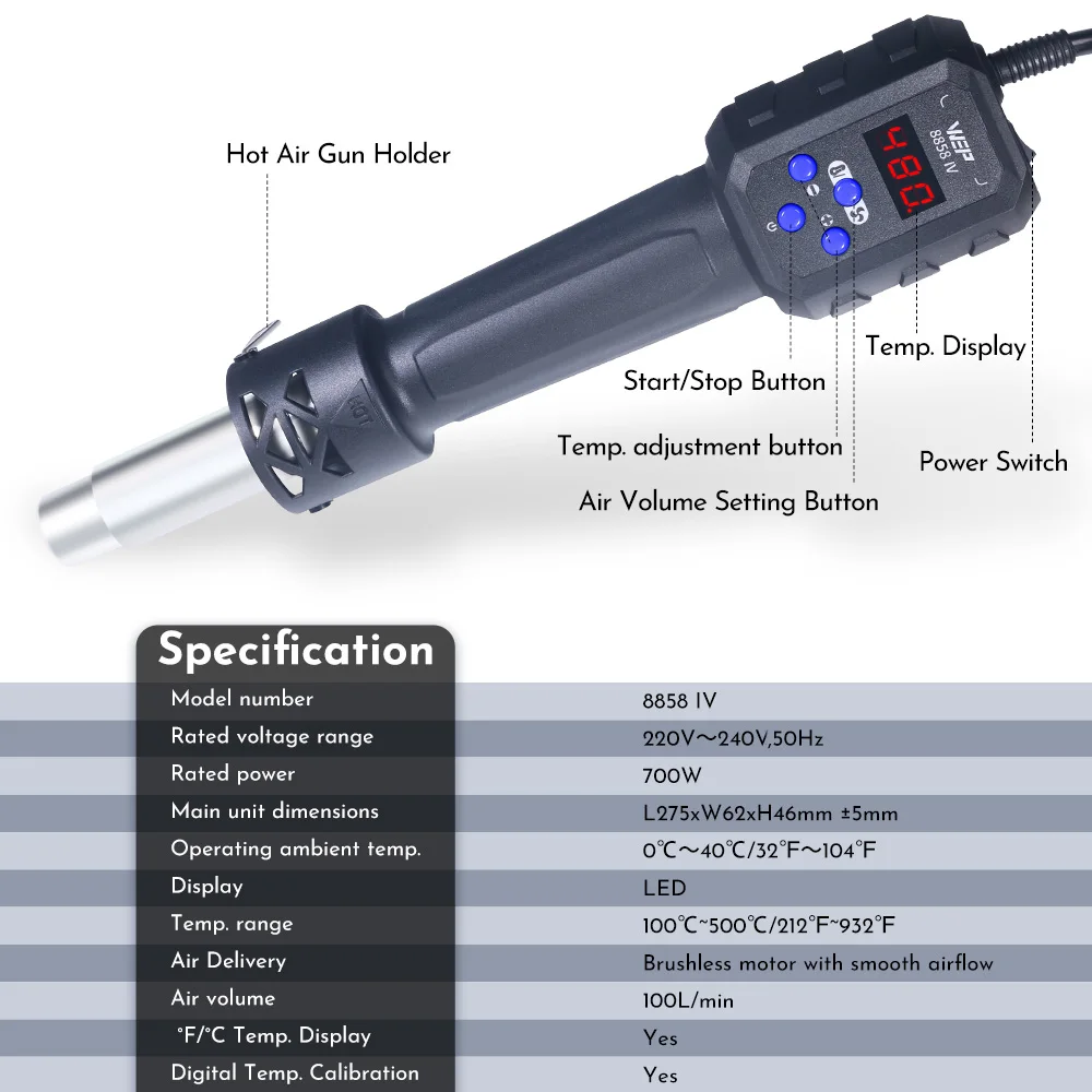 2. You can use this unit for heat shrinking, drying, paint removal, glueremoval, defrosting, pre-heating, glue soldering, and more.