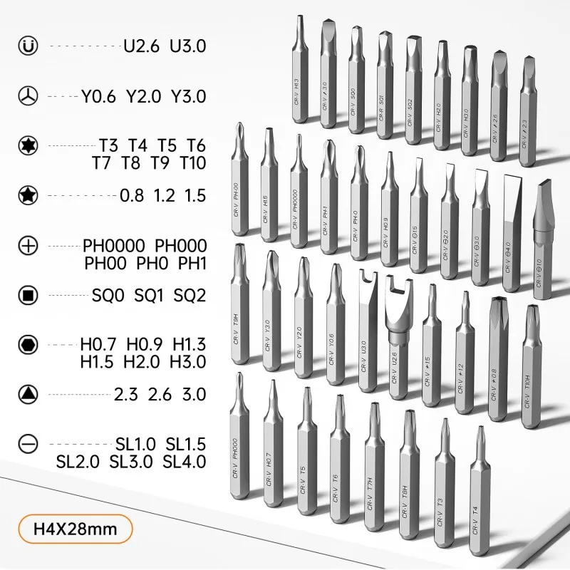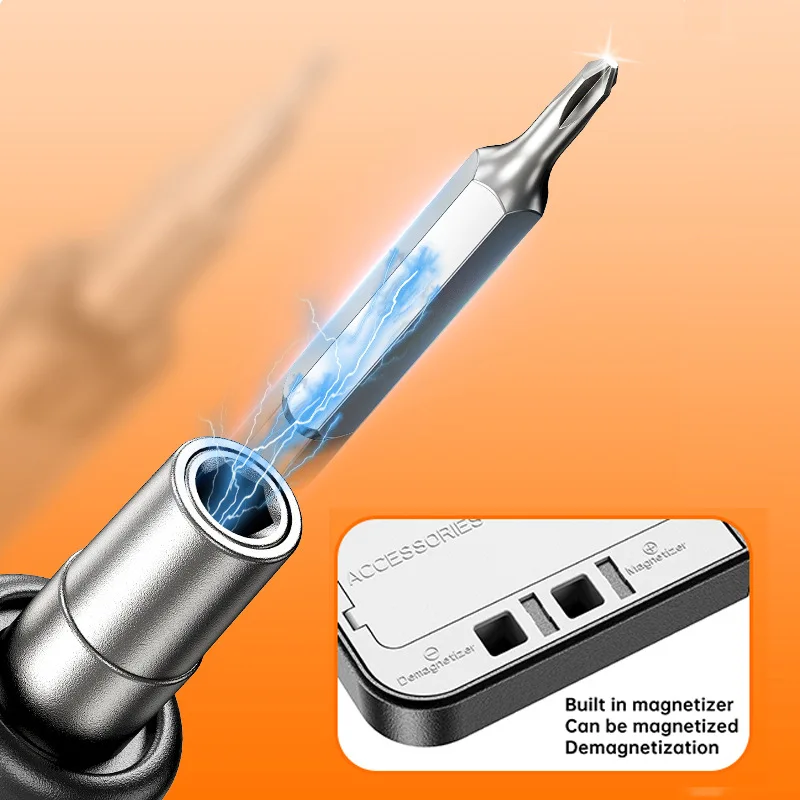 Set includes: 38 screwdriver bits, 1 charging cable, 6 disassembly picks